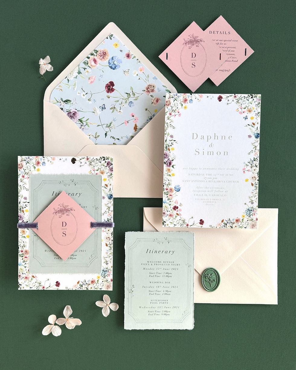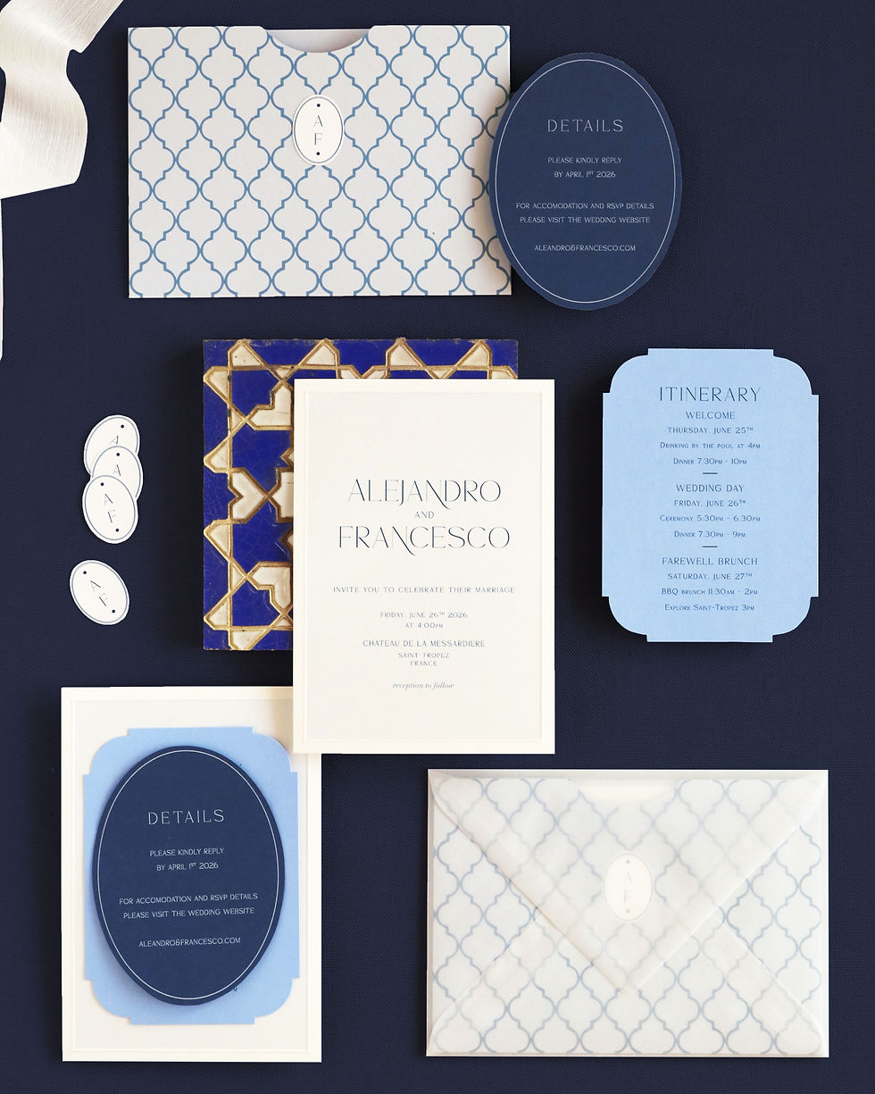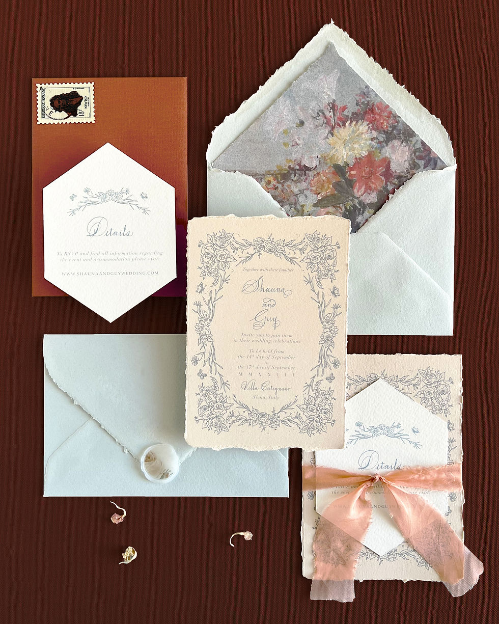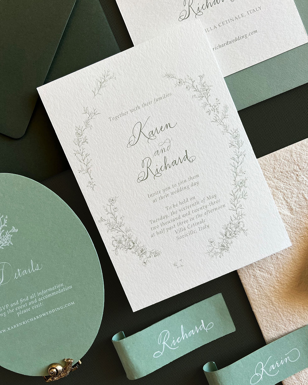 Within 5 to 10 days, the Atelier will present your first Design Draft, featuring your unique paper and color selections. Your order includes two rounds of revisions to fine-tune the text and palette, ensuring the final suite is exactly as you envisioned.